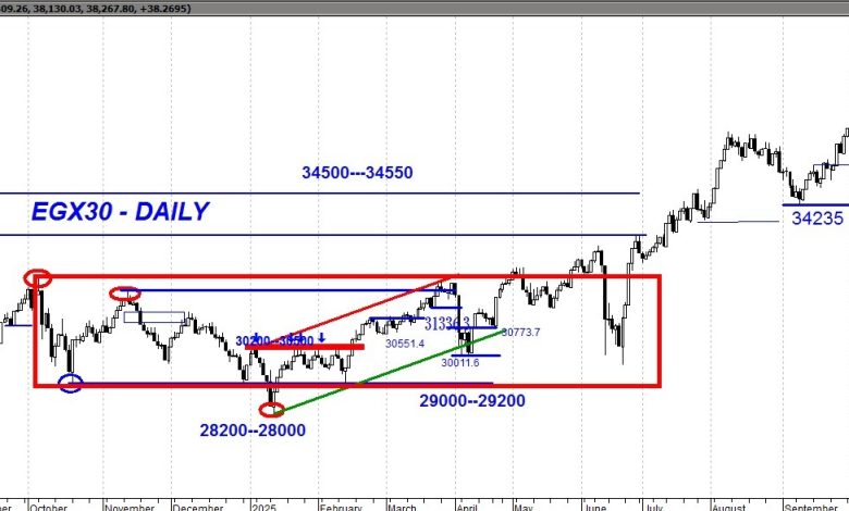بالنظر إلى مؤشر EGX30 على الإطار اليومي، نجد أن القوى الشرائية مازالت هي المسيطر الأكبر على حركة المؤشر خلال الفترات الأخيرة، وهو ما انعكس في استمرار الاتجاه الصاعد القوي بعد نجاح السوق في اختراق مستويات المقاومة المحورية عند 36500 لاعلي ثم تأكيد اختراق 37500 مؤخرًا. المؤشر يتحرك الآن في اتجاه صاعد واضح على المدى القصير والمتوسط، مدعومًا بتتابع القيعان…