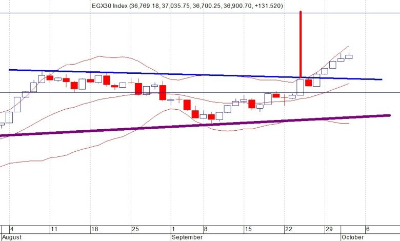 البنوك دوت كوم : اغلق المؤشر العام EGX30 عند مستوى 36900 ويتحرك المؤشر العام في اتجاه صاعدمستهدفا 38500 في الاجل القريب ان شاء الله بعد اختراقه نموذج المثلث المتماثل عند مستوى36000 وكذلك اختراقه للمقاومة التاريخية السابقة عند 36282 ويعتبر مستوى36700 هو مستوى الدعم القريب عند اي تصحيح للمؤشر ومستوى 36300 هو مستوى وقف الخسارة في حال اختراقه لاسفل. اعداد –…
